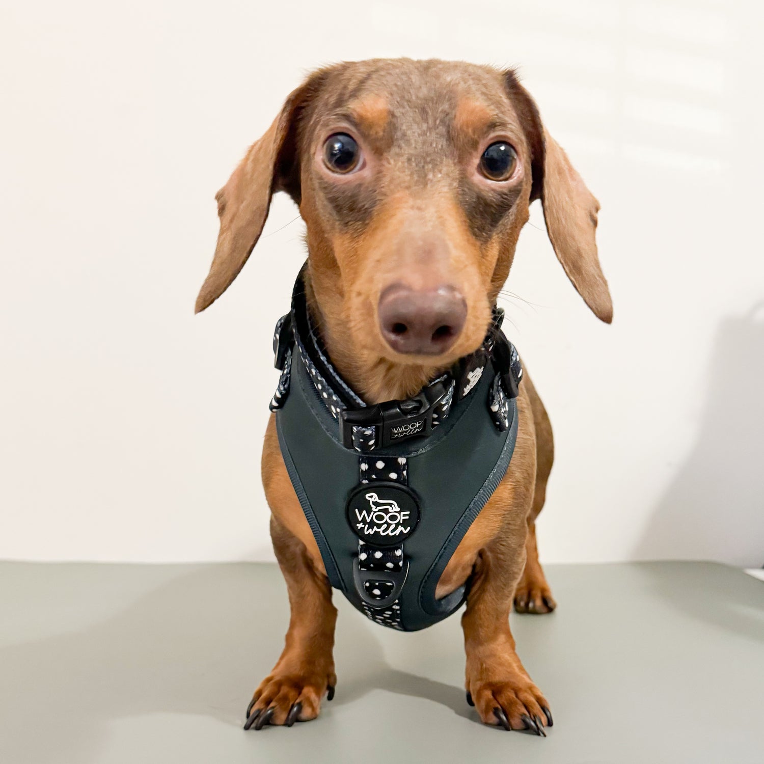 The evergreen polka dot dog harness collection features a stunning dark green dog harness with black and white polka dot accents. Perfect for dogs as small as dachshund puppies and fits most large breed dogs. Your dog will be stunning in this adjustable dog harness no matter the time of year! Great for year round, Christmas, St. Patrick’s Day, Holidays & more! Complete the harness set with the matching dog collar, leash, bow and wastebag holder