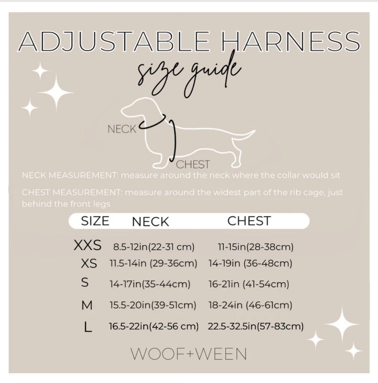The size guide shows the minimum and maximum measurements each size can adjust to. PLEASE NOTE THE MEASURMENTS ARE SHOWN IN BOTH INCHES AND CENTIMETERS. Please follow the instructions of measuring your pup to ensure you order the correct size. If your pup is between sizes, or closer to the end of one size, we suggest sizing up.