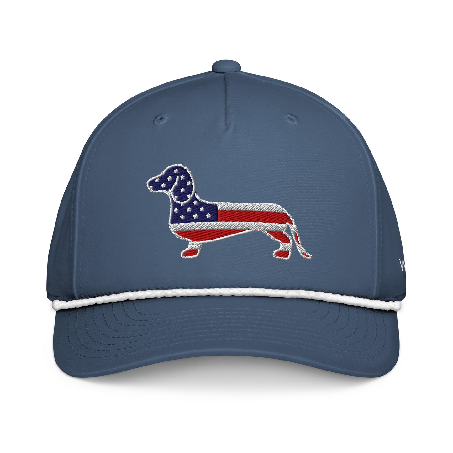 This rope cap features lightweight polyester for all-day comfort with our embroidered signature american flag dachshund design!